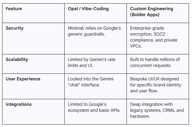 While we are incredibly excited about Opal, it is important to understand the distinction between a Vibe-Coded Tool and a Professional Software Product. As an expert agency, we see three areas where human-led engineering remains indispensable: